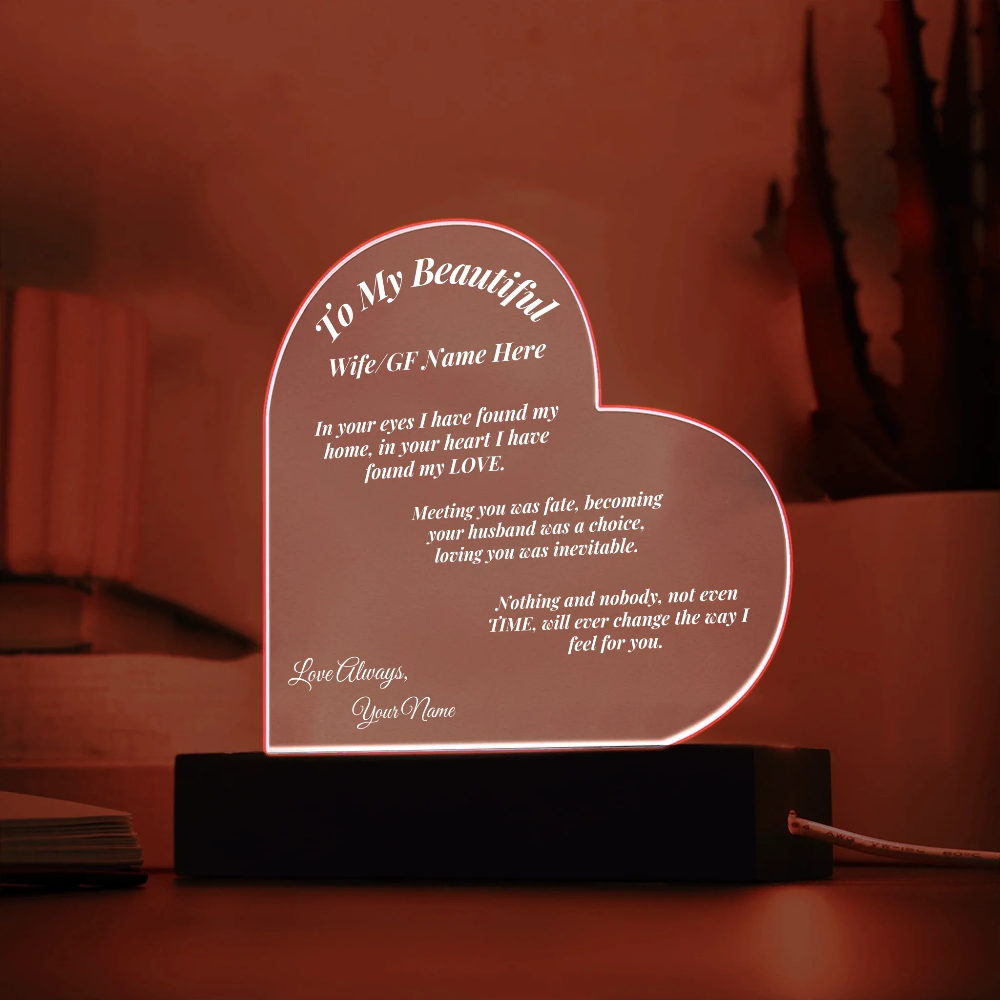 Celebrate the woman who means everything to you with this personalized heart-shaped acrylic plaque. Add her name and yours to create a one-of-a-kind keepsake she’ll treasure for years. The included wooden LED base glows in seven stunning colors light blue, dark blue, yellow, red, green, white, and purple allowing her to display your message exactly the way she loves. Choose between a corded or battery powered base for the perfect fit. Whether you’re searching for gifts for your wife, gifts for your girlfriend, or meaningful gifts for women who value sentimental surprises, this custom heart plaque delivers emotion, beauty, and a glowing reminder of your bond.